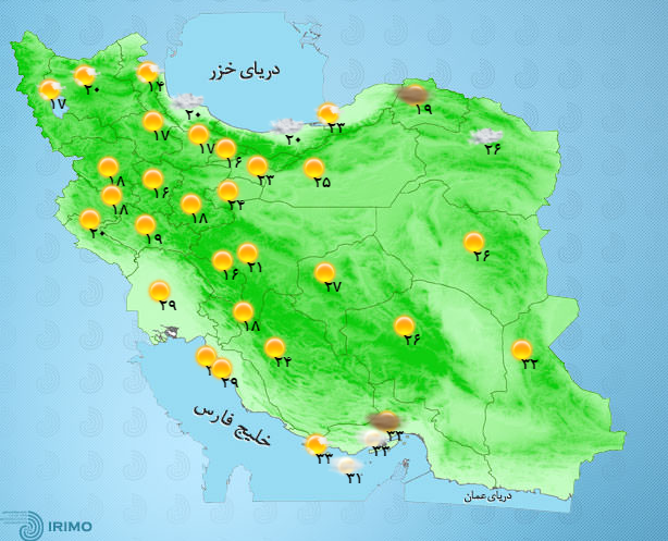 روز شنبه درغالب مناطق کشورآسمان صاف وآفتابی و روند افزایش نسبی دما، بویژه در نوار شمالی کشورپیش بینی می شود و بعد از ظهراین روزتنها ارتفاعات خراسان شمالی وشمال خراسان رضوی افزایش ابر و بارش پراکنده و وزش باد رخ خواهد داد از بعد از ظهر روز یک شنبه بتدریج با نفوذ جریانهای شمالی درسواحل دریای خزر ابرناکی، بارش پراکنده باران ومه صبحگاهی پیش بینی می شود.