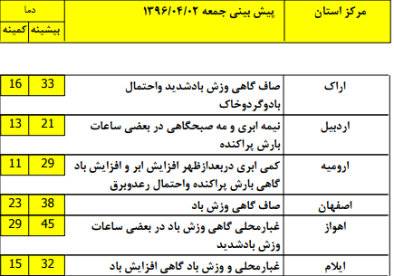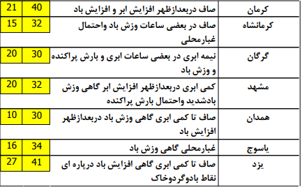 درمناطق شمالی استانهای آذربایجان شرقی و آذربایجان غربی و جنوب سیستان و بلوچستان نیزدر بعد از ظهر روز یک شنبه رگبار باران گاهی با رعد و برق و وزش باد رخ خواهد داد.