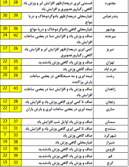 شایان ذکر است که امروزنیز با شدت کمتری دراستان های خوزستان و بوشهر گاهی وزش باد شدید پیش بینی می شود که در برخی مناطق این استان ها سبب ایجاد گرد و خاك، کاهش کیفیت هوا و دید افقی خواهد شد.